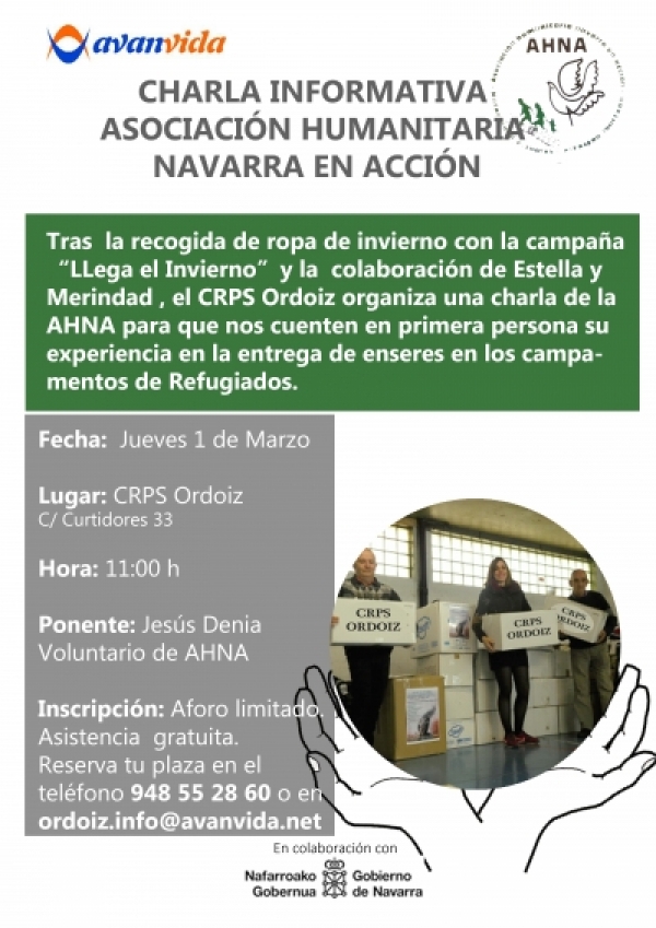 Tras la recogida de ropa de invierno con la campaña «Llega el invierno» y la colaboración de Estella y Merindad, el CRPS Ordoiz organiza una charla de la ANHA para que nos cuenten en primera persona su experiencia en la entrega de enseres en los campamentos de Refugiados.